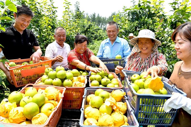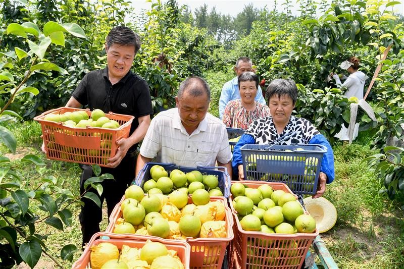 7月14日,安徽省亳州市利辛县巩店镇金果种植专业合作社的260多亩翠冠梨成熟上市,果农们忙着采摘、分拣、装箱、供应市场等工作。近年来,利辛县因地制宜调整农业产业结构,采取“党支部+合作社+农户+旅游”的方式,将传统林果业与乡村生态旅游相结合,发展集旅游观光、生态采摘于一体的特色农业旅游经营模式,带动了农民增收致富。刘勤利 摄