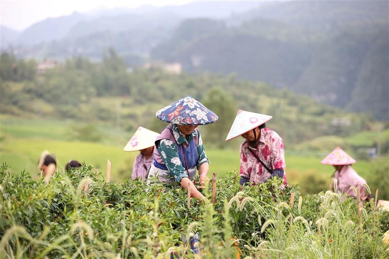 核心提示:图为8月7日村民在贵州省黔东南苗族侗族自治州丹寨县兴仁镇烧茶村采收辣椒。