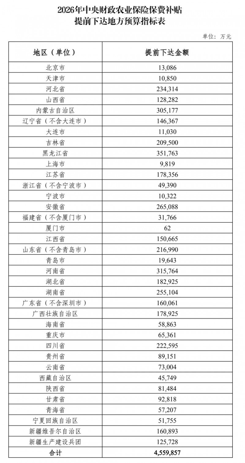为支持农业保险发展,更好服务保障国家粮食安全,财政部发布通知,提前下达中央财政农业保险保费补贴2026年预算456亿元。