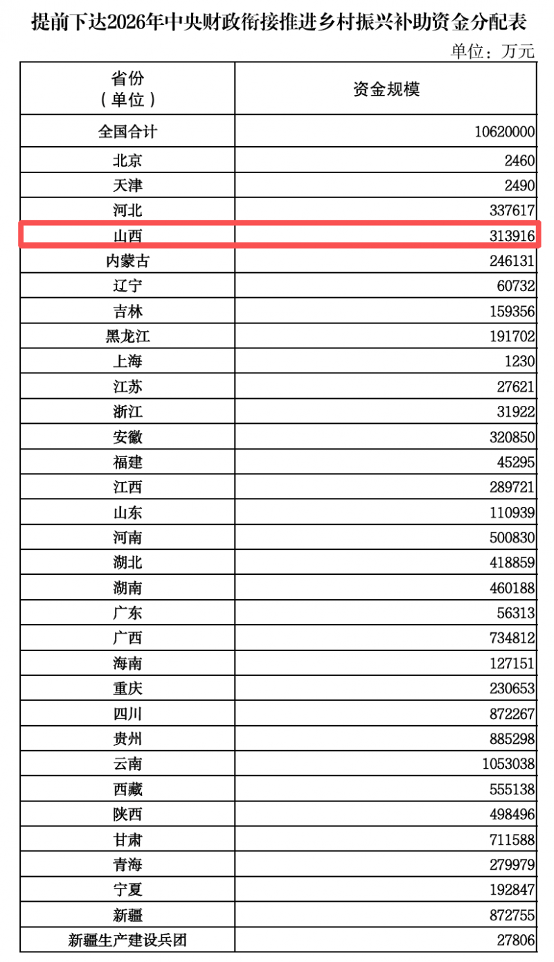 财政部提前下达!山西313916万元! 1062亿元! 财政部提前下达 2026年乡村振兴补助资金! 近日 财政部网站发布 提前下达2026年中央财政衔接 推进乡村振兴补助资金分配表 分配表显示 山西获313916万元补助 来源:财政部网站