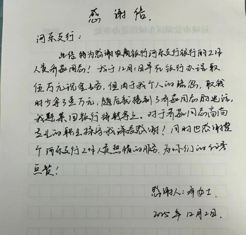 【诚信文化】河东支行:小善举诠释大诚信,感谢信映照服务心 近日,客户乔女士专程将一封饱含深情的亲笔感谢信送至河东支行。信中,她以真挚的笔触写道:“对于乔茹同志高尚专业的职业操守我深表感谢!”“感谢河东支行工作人员热情的服务,为你们的优秀点赞!” 同时,乔女士在信中详细讲述了事情的经过。12月1日,她在河东支行办理业务后,因匆忙离开,不慎将一万元现金遗落在柜台窗口。柜员乔茹在事后清理时发现该笔现金,没有丝毫犹豫,她立即根据业务记录查找客户信息,第一时间与乔女士取得联系。电话中,乔茹以温和而清晰的语调说明了情况,经耐心核对,确认该现金确系乔女士所遗落。此时乔女士才意识到自己的疏忽,在连声道谢后迅速返回网点。乔茹在仔细核实身份信息后,将一万元现金交还到乔女士手中。 小事见真情,微行显担当。一直以来,运城农商银行始终秉持“做运城服务最好的银行”理念,将职业道德教育融入日常培训,将优质服务理念深植员工心中。乔茹同志拾金不昧的行为,正是运城农商银行管理文化和职业精神的生动诠释,展现了尽职履责、争先创优的企业核心价值理念和诚实守信、以义取利的中国特色金融文化。 供稿:河东支行