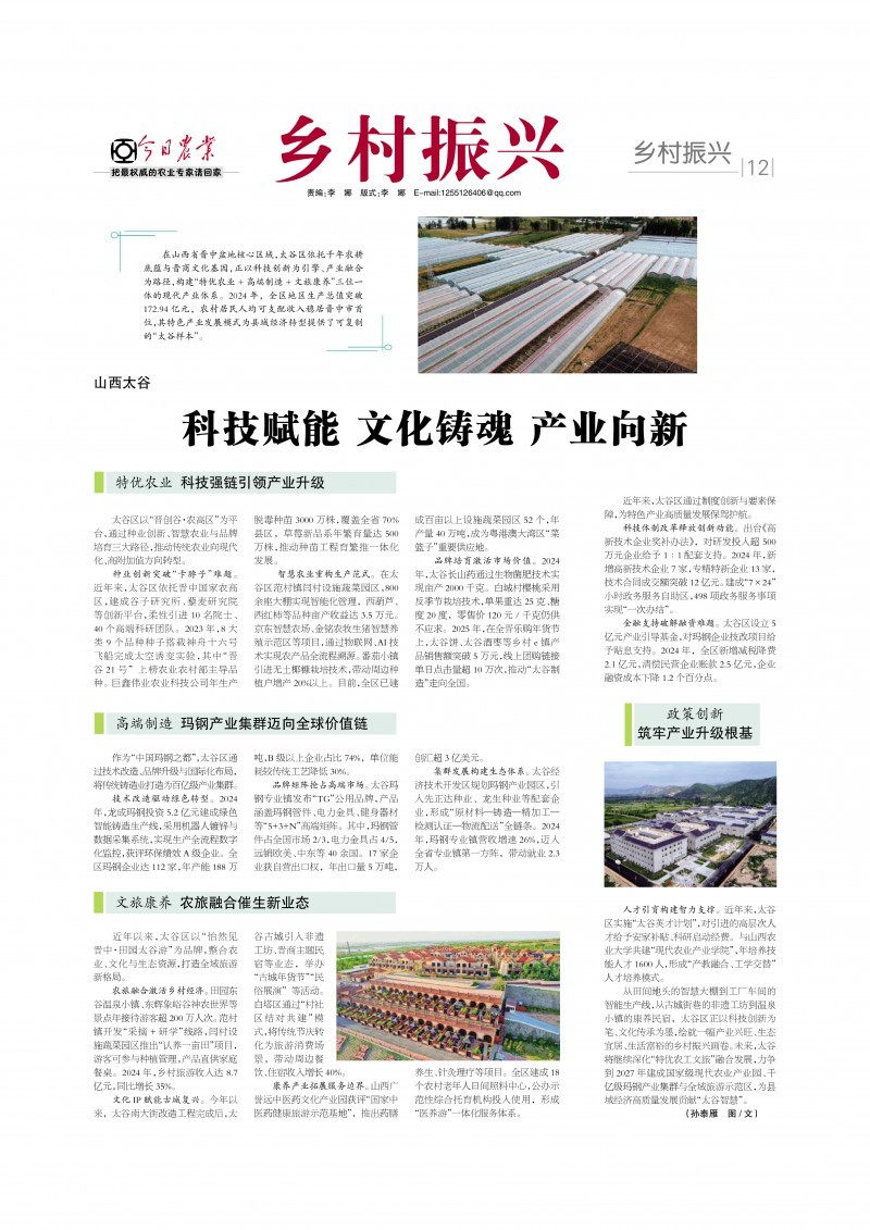 从田间地头的智慧大棚到工厂车间的智能生产线,从古城街巷的非遗工坊到温泉小镇的康养民宿,太谷区正以科技创新为笔、文化传承为墨,绘就一幅产业兴旺、生态宜居、生活富裕的乡村振兴画卷。未来,太谷将继续深化“特优农工文旅”融合发展,力争到2027年建成国家级现代农业产业园、千亿级玛钢产业集群与全域旅游示范区,为县域经济高质量发展贡献“太谷智慧”。(孙泰雁 图/文)