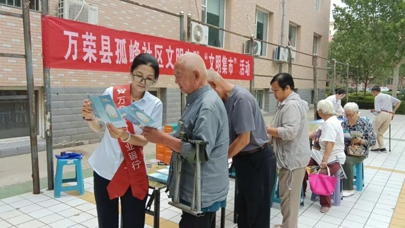 7月24日上午,万荣县孤峰社区“文明集市”上,新城区储蓄所开展了“全民反诈在行动”宣传活动,将反诈知识送到群众身边,有效提升居民防诈意识和能力。