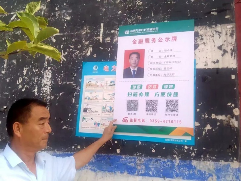 金融服务公示牌张贴在各村村委会公告栏、村民广场等群众集中活动的公共区域,每一块服务牌上都清晰展示了客户经理照片、姓名、电话,方便群众远程咨询和预约业务,信用卡申请、晋享e贷二维码的公示,让群众实现了家门口“线上办业务”。