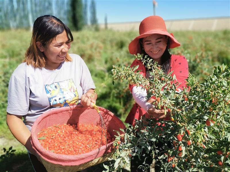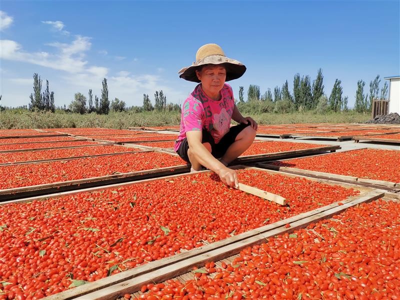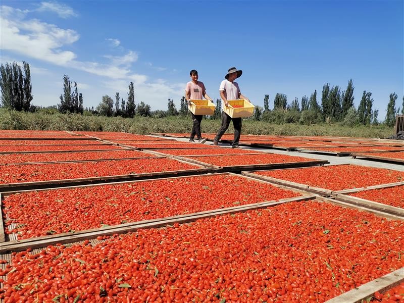新疆阿瓦提县枸杞丰收 近年来,新疆阿瓦提县坚持党建引领乡村振兴,采取“党支部+合作社+基地+农户”发展模式,大力发展红枸杞特色经济产业,助力群众增收致富。6月15日,村民在瓦提县巴格托格拉克乡卡尔库杰克村采摘、晾晒枸杞,准备上市销售。 来源:中国农网