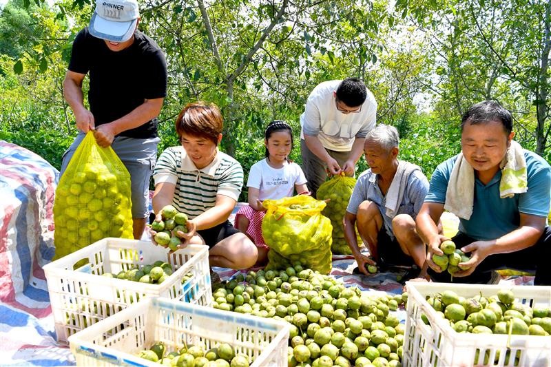 安徽亳州:特色种植助农增收 8月9日,在安徽省亳州市谯城区双沟镇三官村方向家庭农场,果农在核桃园里收获鲜核桃。近年来,亳州市积极调整农业产业结构,引导农民大力发展特色种植,采取“合作社+基地+农户”的模式,通过核桃种植、加工等产业发展,帮助农民增收致富。 刘勤利 摄 来源:中国农网