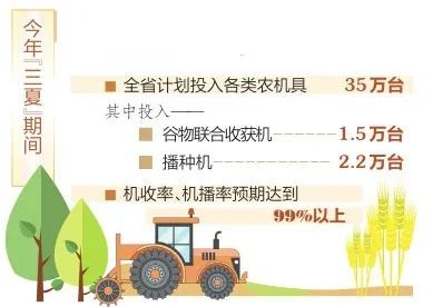 5月20日,从省农机发展中心获悉,今年“三夏”期间,全省计划投入各类农机具35万台,其中投入谷物联合收获机1.5万台,播种机2.2万台;机收率、机播率预期达到99%以上。