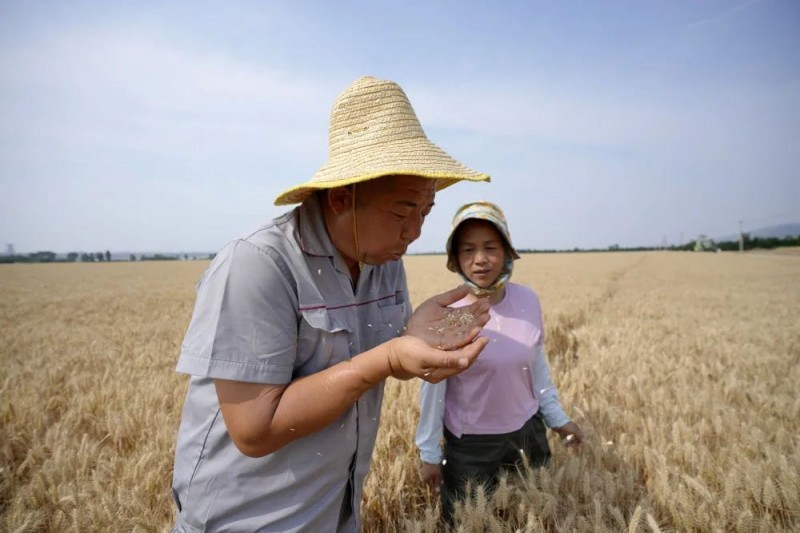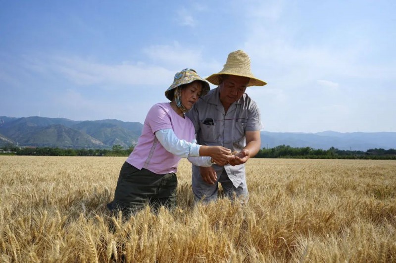 种粮大户董会龙和妻子范月亲站在田间