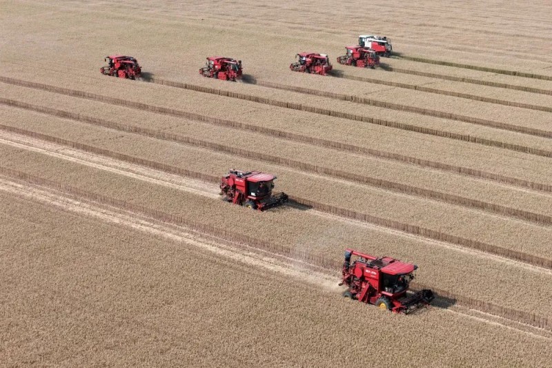 合作社的一台台收割机发出隆隆的轰鸣声