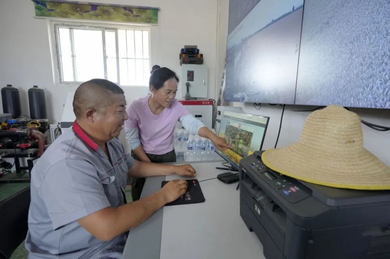 在山西省运城市盐湖区解州镇曲村,董会龙(左)和妻子范月亲通过农机精准作业平台查看农机手作业情况(5月27日摄)。
