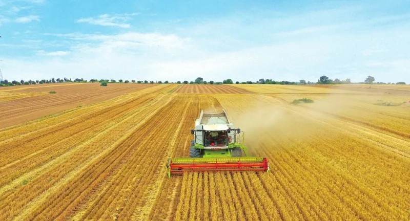 麦浪翻涌,收割机在麦田里往来穿梭,随着齿轮飞转,麦秆齐刷刷倒下,金灿灿的麦粒如瀑布般倾泻进粮仓。