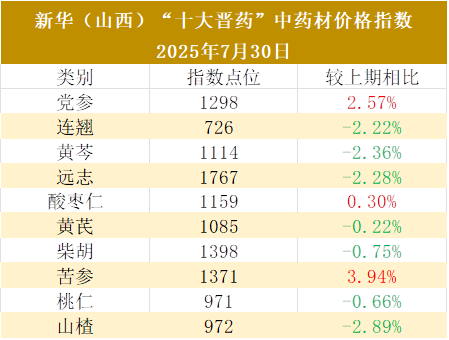 从细分指数来看,7月下半月山西“十大晋药”中药材价格指数三涨七跌。其中,潞党参报1298点,较上期上涨2.57%;连翘报726点,较上期下跌2.22%;黄芩报1114点,较上期下跌2.36%;远志报1767点,较上期下跌2.28%;酸枣仁报1159点,较上期上涨0.30%;黄芪报1085点,与上期下跌0.22%;柴胡报1398点,较上期下跌0.75%;苦参报1371点,较上期上涨3.94%;桃仁报971点,较上期下跌0.66%;山楂报972点,较上期下跌2.89%。