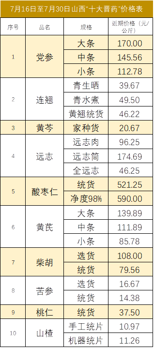 图3 7月16日至7月30日山西“十大晋药”价格表
