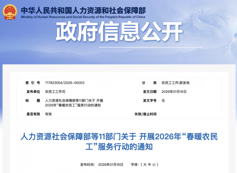 人力资源社会保障部等11部门关于开展2026年“春暖农民工”服务行动的通知