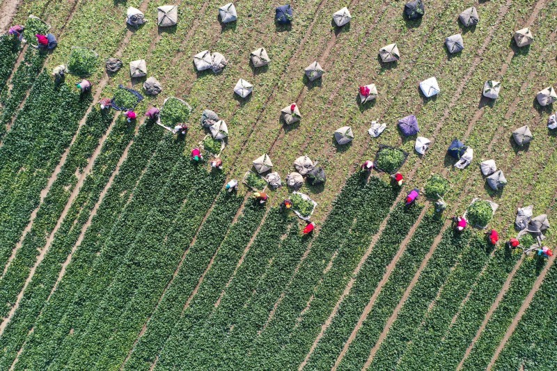 11月18日,在山东省高密市姜庄镇吴家屯村,村民在采收菠菜(无人机照片)。新华社发(李海涛 摄)