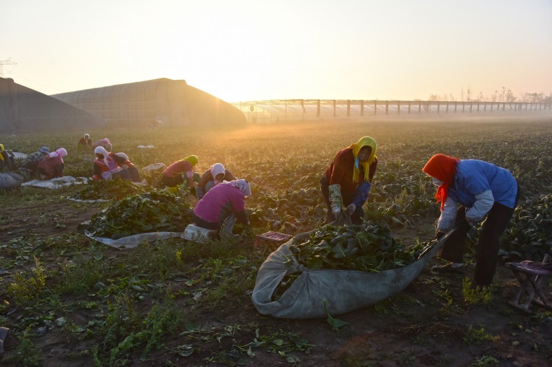 11月18日,在山东省高密市咸家社区万亩良田家庭农场,村民迎着晨光采收菠菜。新华社发(李海涛 摄)