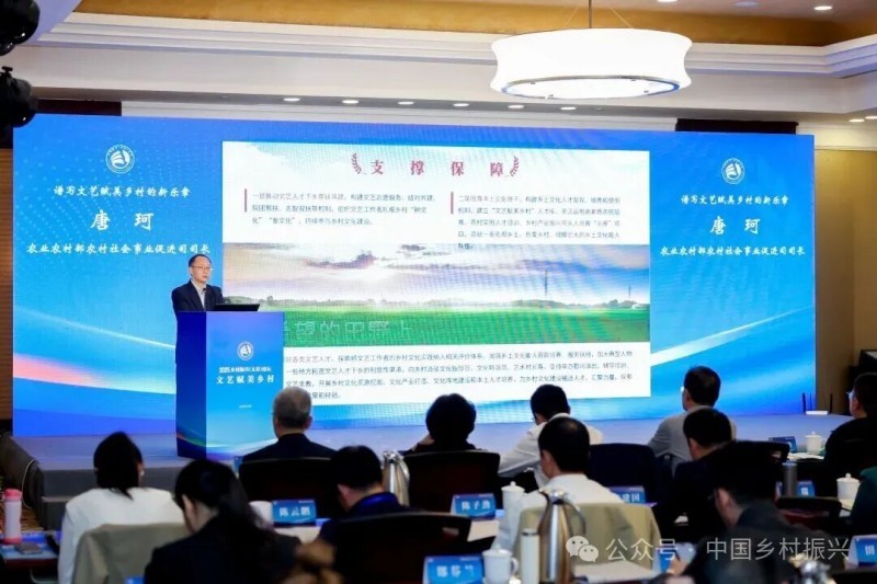 农业农村部农村社会事业促进司司长唐珂以《谱写文艺赋美乡村的新乐章》为题作主题报告,他表示,文艺赋美乡村源于时代的呼唤、现实的需要与实践的伟力,既是对以往艺术乡建经验的总结提炼,又是对当前农民群众精神文化需求的精准回应,更是对未来乡村文化建设的引导布局。他强调,要把凝心聚力、培根铸魂作为“赋美”的根本任务,把充分发挥乡村美学的综合效益作为核心目标,把精准满足农民群众精神文化需求作为出发点和落脚点,并着力构建乡村文艺人才发展机制,为文艺赋美乡村工作提供人才保障。文艺赋美乡村具有很强的政治性、实践性、公益性,要始终坚持党的领导,突出农民主体;要坚持因地制宜,做到稳中求进,广泛动员社会各方面力量共建共享。