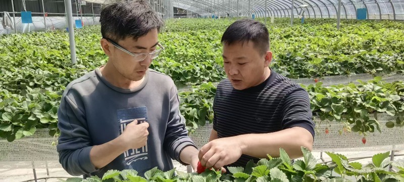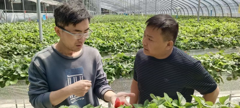 4月18日,张保强正在向客户介绍高架草莓栽培特点。