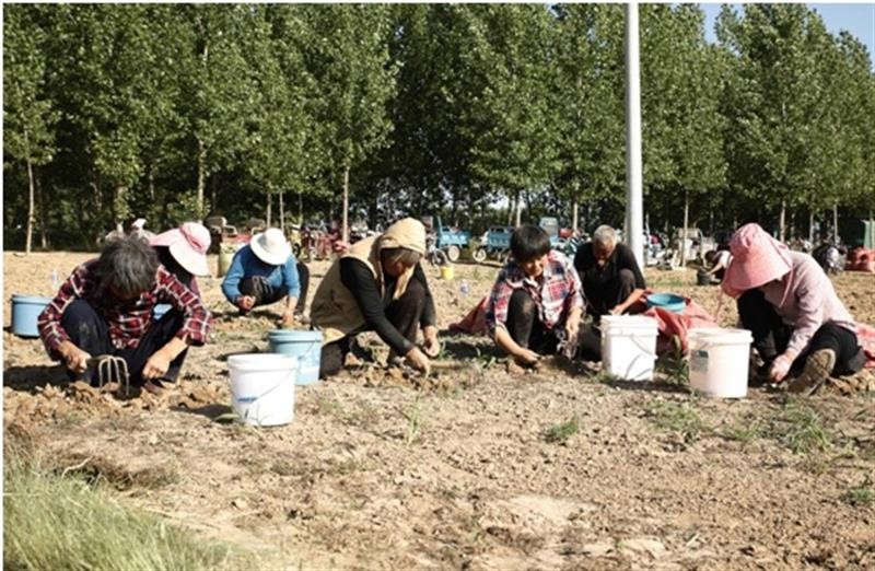 近日,走进河南省尉氏县南曹乡朱坡村的田间地头,头戴各色遮阳帽的农户们一字排开,一人一小桶、一小耙子、一大袋子,正在全力采挖元胡。