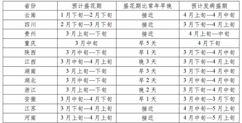 表2 油菜主产区盛花期和发病盛期预测表