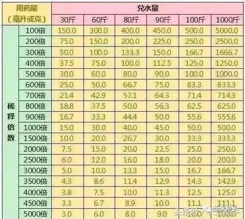 粉色区域里数字是兑水量;黄色区域里的数字是农药用药量;绿色区域里的数字是稀释倍数。查找起来非常方便,大家只需要对照表格的横向一行和纵向的一列,找到交叉地方的数字就能知道加剂量了。