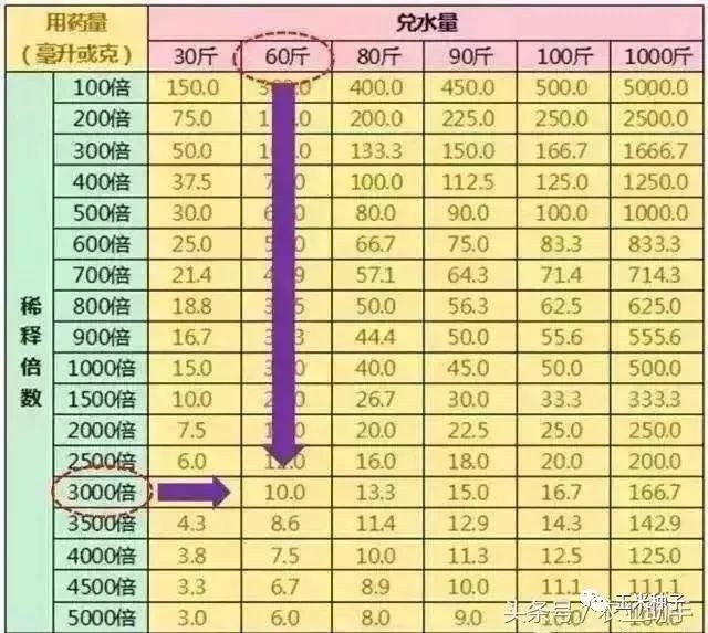 比如,我们需要配制的药剂是稀释3000倍的,要兑60斤水,那我们就先从最左侧找到3000倍这个数字,再在右上方的兑水量中找到60斤,找到交叉的数字,就能得到所需要的药剂量,是10毫升或10克。
