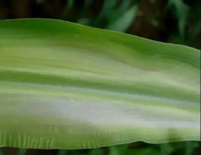 2、缺镁:叶片沿叶脉纵向失绿,但失绿条纹时断时续。
