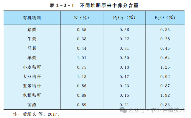堆肥的主要原料为各类畜禽粪便,重量比应占到80%左右;辅料可以采用各类作物秸秆作为主要辅料,也可以材料农产品加工副产物或者养殖场垫料。常年进行堆肥的园主尽可能选择来源广泛和稳定的堆肥原料。相对来讲,同一类型和来源的原料养分含量、C/N比等参数相对稳定。每年各类原料配比可以相对保持一致,保证堆肥效果的稳定性。下表为堆肥常用原料的养分含量,仅供参考。来源不同的有机物料,尤其是各类畜禽粪便,养分含量差异巨大,因此有测试条件的尽可能测试其中的养分含量后使用。