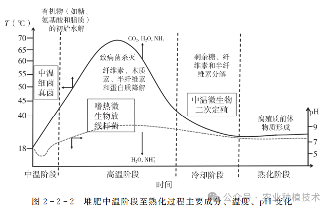 (2)堆肥过程温度控制:一般情况下,堆肥的温度变化可以作为堆肥过程(阶段)的评价指标。根据温度的变化,堆肥过程可以划分为四个阶段:中温阶段、高温阶段、冷却阶段、熟化阶段。中温阶段(15-45℃)大约持续3天左右,温度升至40℃以上进入高温阶段,高温阶段最适宜的温度为55-60℃,极限温度可达80℃左右。堆体高温维持时间一般为5-10天,此阶段可将大部分病原菌、虫卵、杂草种子杀死,实现畜禽粪便的无害化处理。高温阶段结束后进入冷却阶段温度在40℃以下,最后进入熟化阶段。整个过程持续时间为30-40天左右。堆肥过程的高温阶段是堆肥成功的关键,高温阶段时间过长或过短都需要对配方进行调整。